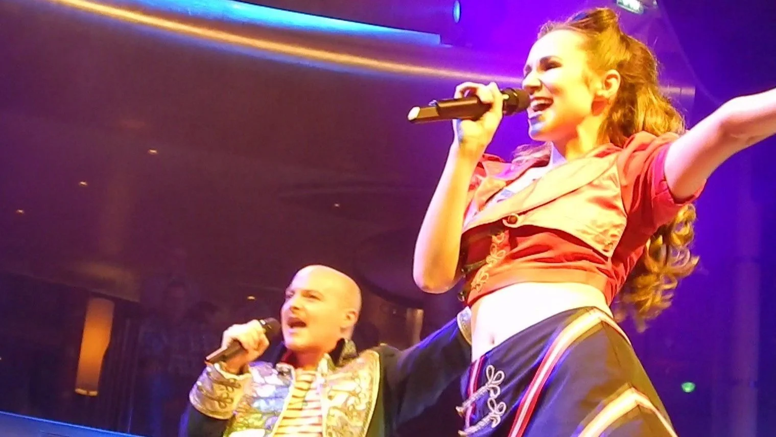 I’m Santino, originally from Cambridge, England. Emily is a Suffolk County native. We met as lead vocalists in the show ensemble on a German cruise ship, performing full-scale productions across Europe, Dubai, India, and the Emirates. Many of these shows were entirely in German, a language we didn’t even speak, so we learned to sing complex scores phonetically, trusting each other and a lot of muscle memory every night on stage. Somewhere between the spotlights and ports of call in Greece, Italy, and Mumbai, we fell for each other.
